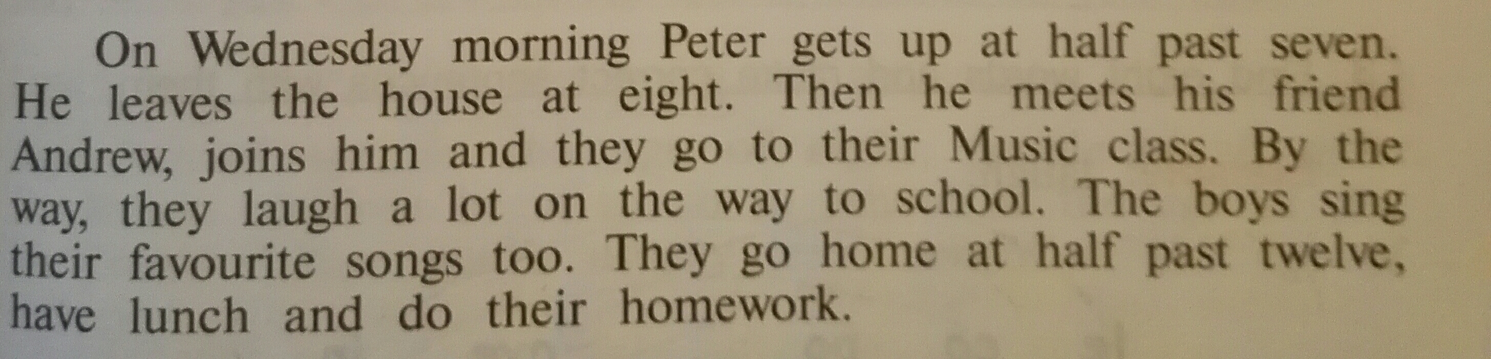 я так понимаю это надо перевести в past simple?? On Wednesday morning Peter got up at half past seven. He left the house at eight. Then he met his friend Andrew, joined him and they went to their Music class. By the way, the laughed a lot on the way to school. The boys sang their favorite songs too. They went home at half past twelve, had lunch and did their homework.