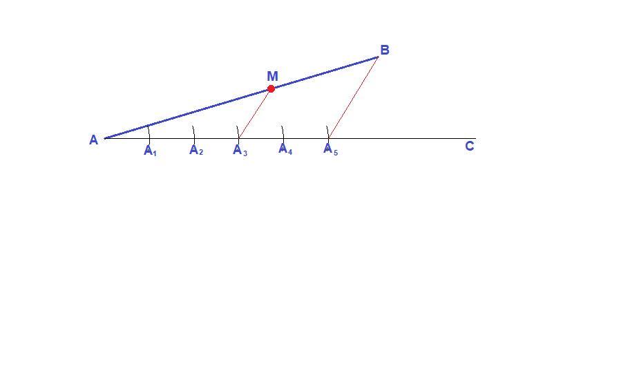 Через точку А₃ проведем прямую, параллельную прямой А₅В. Точка пересечения этой прямой с отрезком АВ делит его в отношении 3:2, т.е.