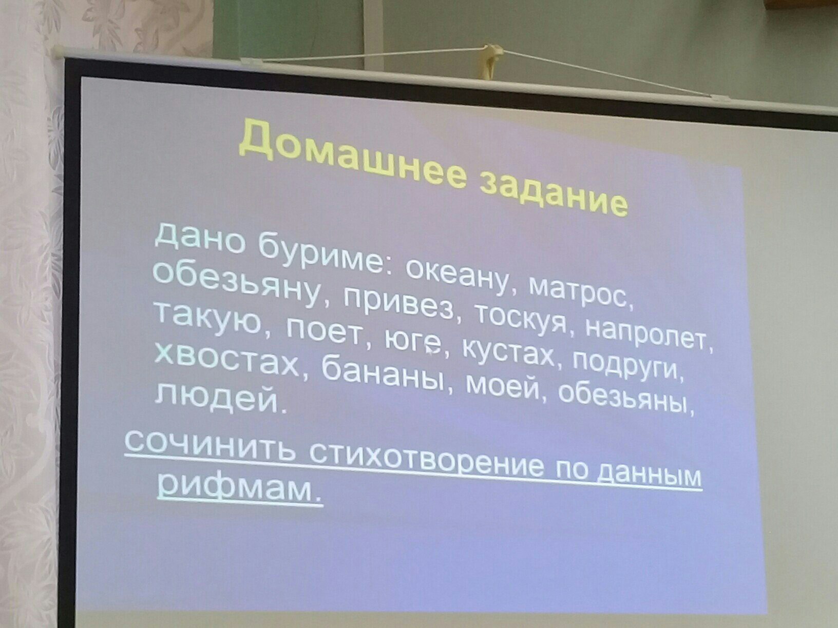 По океану плыл матрос обезьяну он привез и тоскуя по девице день и ночь её он ждал такую там на севере поёт а на юге ветер кусты трясутся и подруги все недаждутся а макака все бананы съела