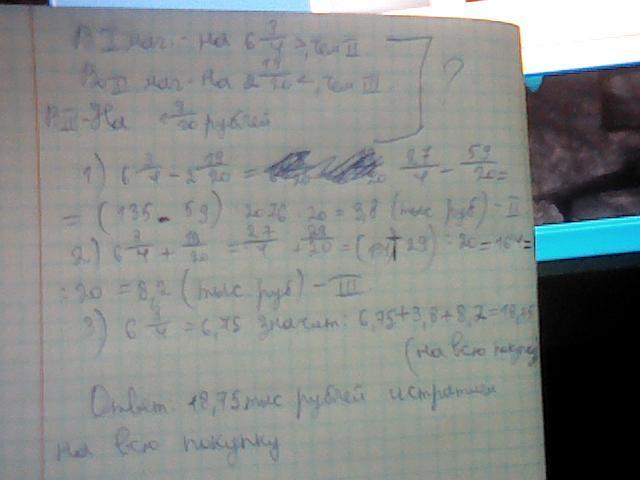 3 магазин - 6 3/4 + 1 9/20 = 6 15/20 + 1 9/20= 8 4/20