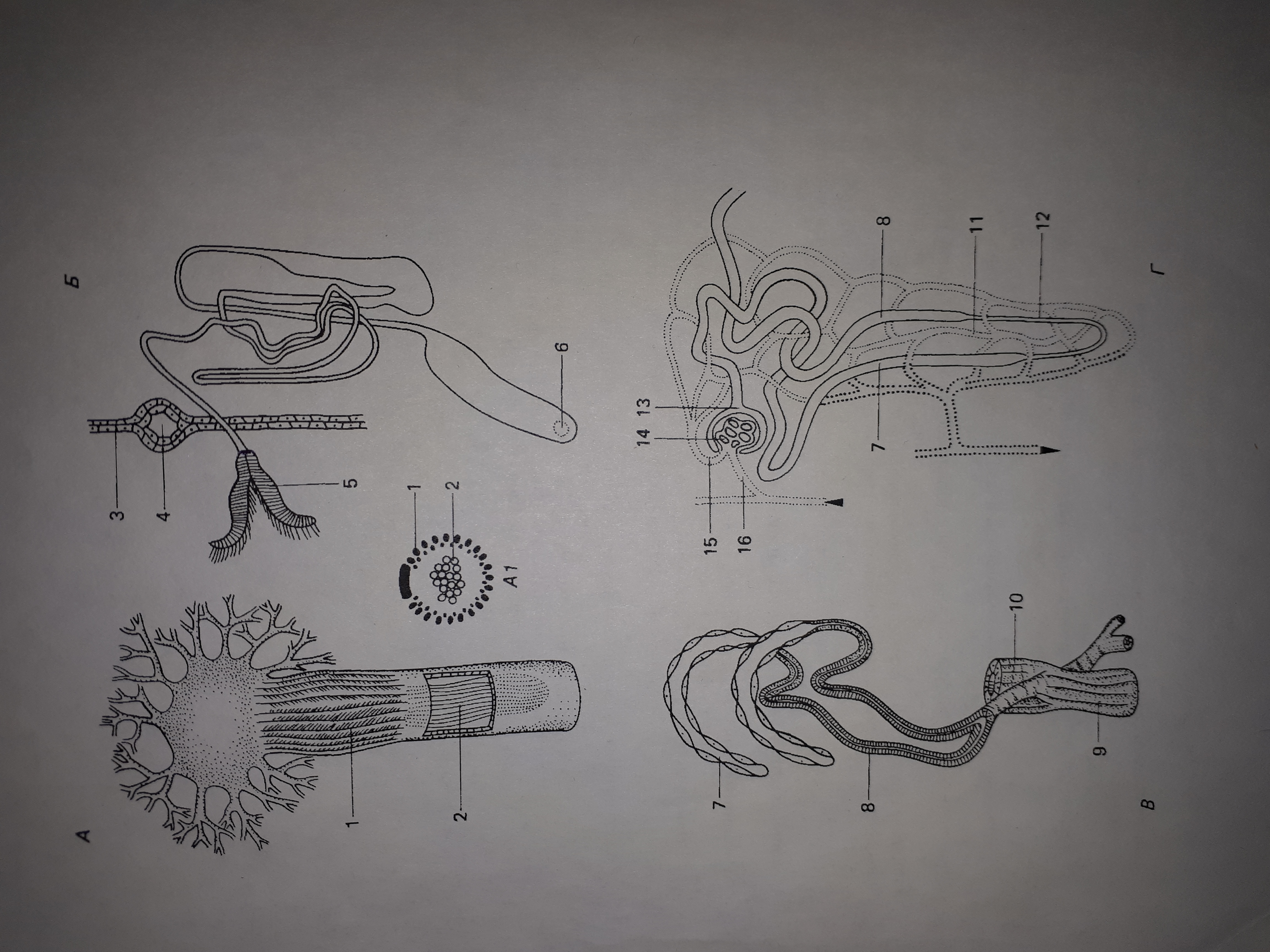 Что изображено на рисунке А,Б,В?На рисунке Г - нефрон.(Остальное должно быть связано с выделительными системами)