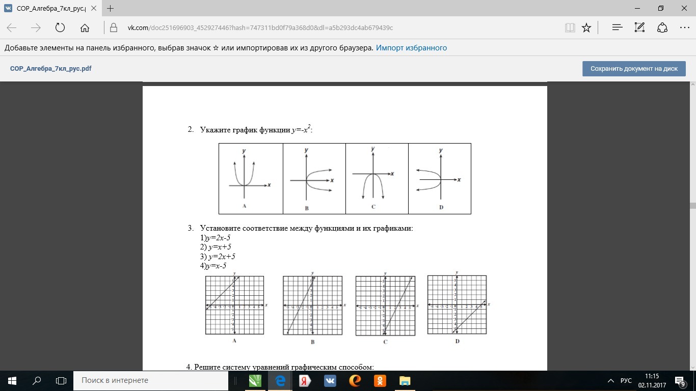 в каждом случае подставляем значения х и находим значения у,и видим ,что ответы при решении совпадают со значениями точек по графикам.
