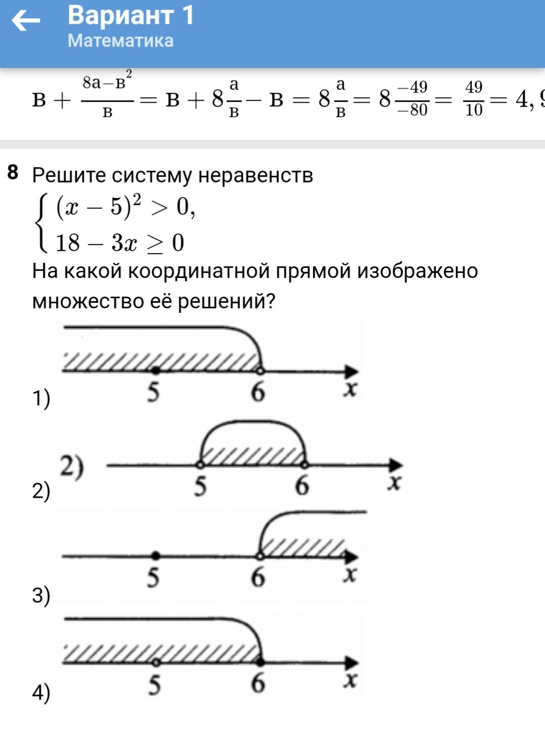 18 -3х = 0, ⇒ 3х = 18,⇒х = 6. смотри где в ответе число 6 обозначено точкой, не "дыркой". Это ответ 4)