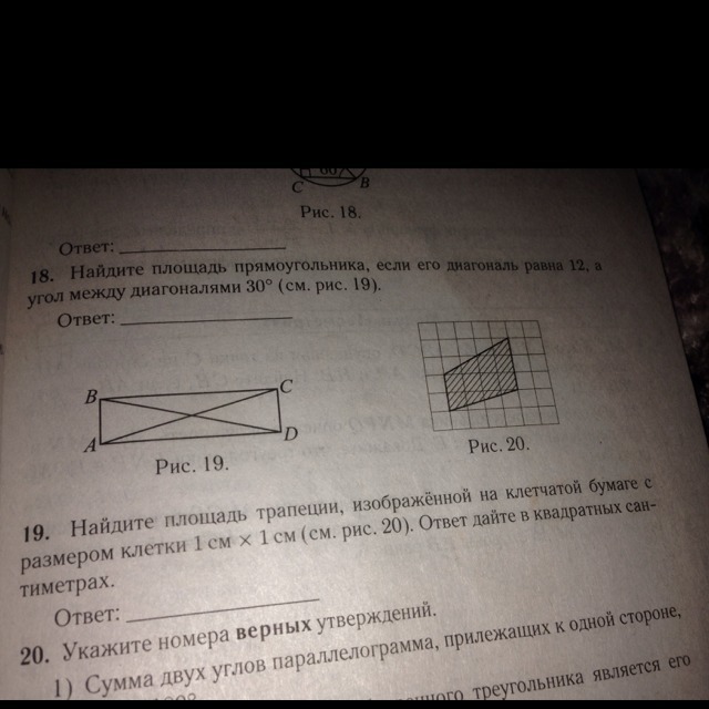 Найдите площадь прямоугольника,если его диагональ равна 12,а угол между ними диагоналями 30 ( рис .19)Должновыйти36