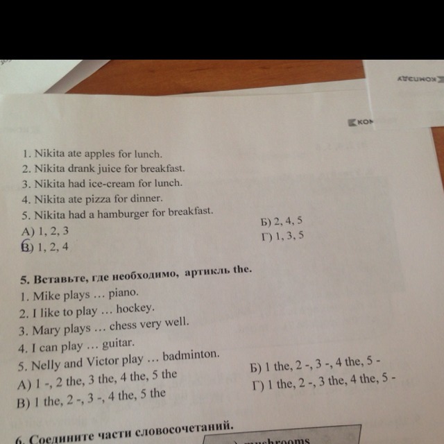 5. Б) потому что артикль the не используется когда мы говорим о виде спорта; а используется когда речь идет о музыкальных инструментах