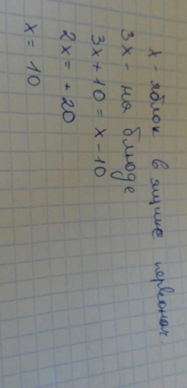 На блюде яблок было в 3 раза меньше,чем в ящике.Когда на блюдо переложили 10 яблок из ящика,то в ящике и на блюде стало яблок поровну.Столько яблок было в ящике первоначально.
