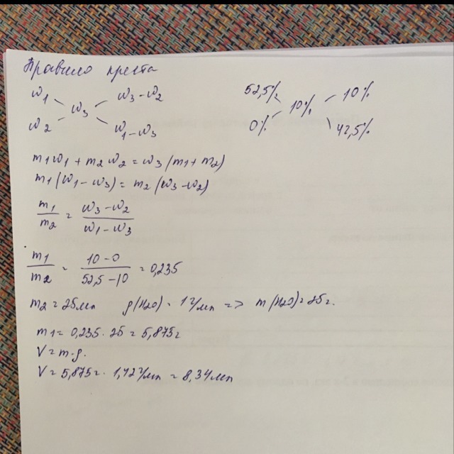 Рассчитайте объём 52,5%-ого раствора H2SO4 плотностью 1,42 г/мл, к которму надо добавить 0,025 л воды для приготовления 10%-ого раствора.