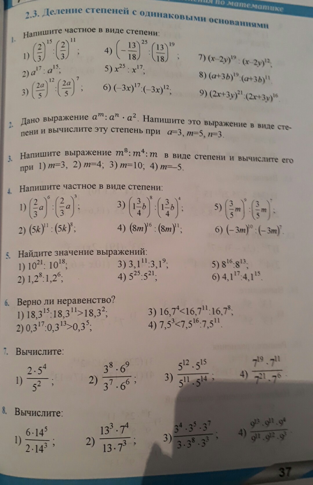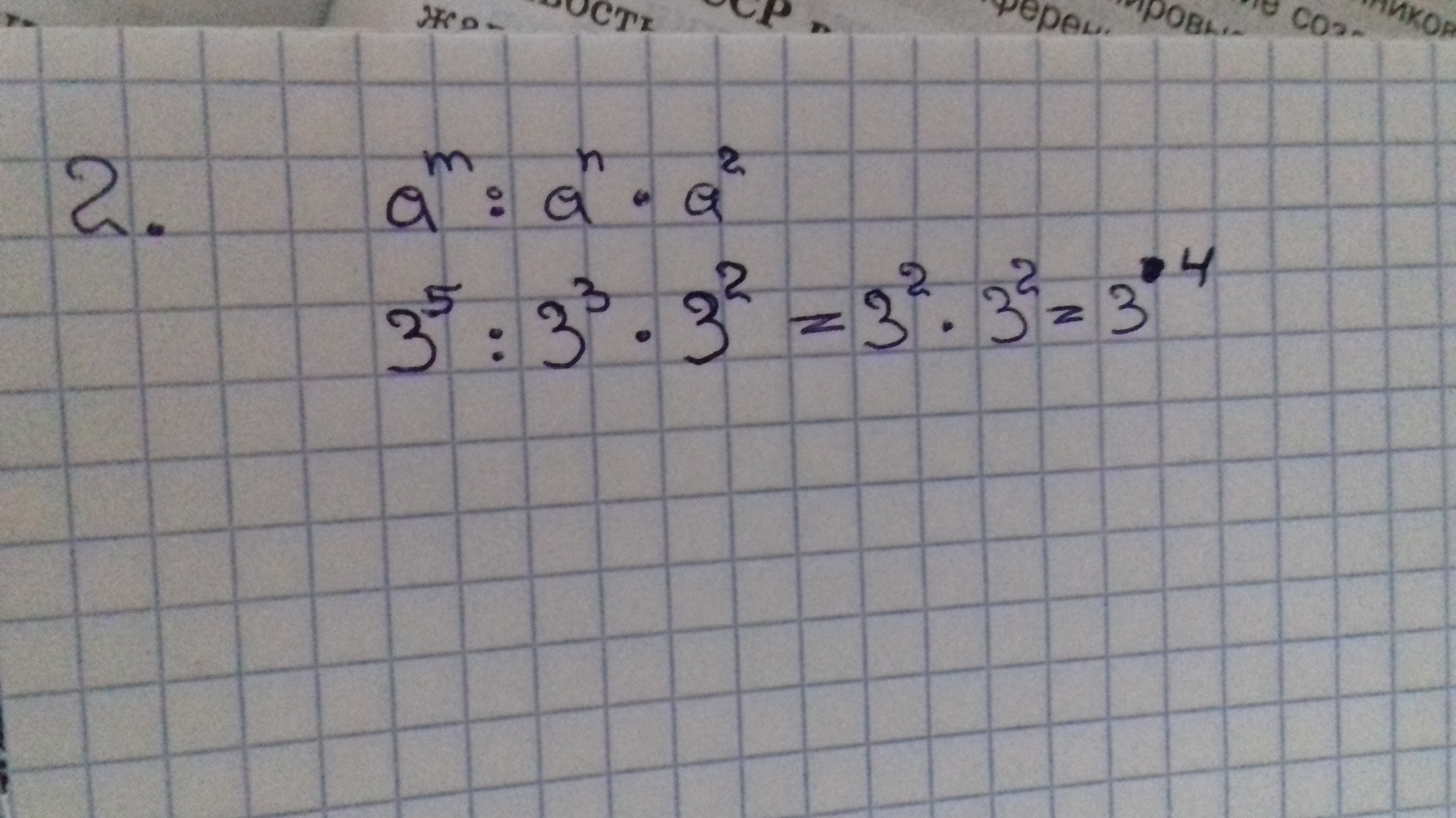 Когда одинаковое число :при делении степень минусуется,при умножении-плюсуется.Всё просто.Когда число без степени, подразумеваем, что оно в первой степени.Только вот я не знаю,нужно ли в конце возводить число в степень.Если решите,что это необходимо калькулятор вам в помощь.
