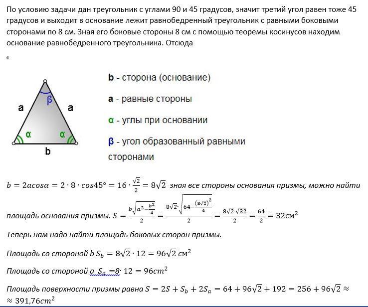 основание прямой призмы прямоугольным треугольник с катетом 8 см и острым углом 45 боковые ребра равны 12см найди площадь полной поверхности призмы