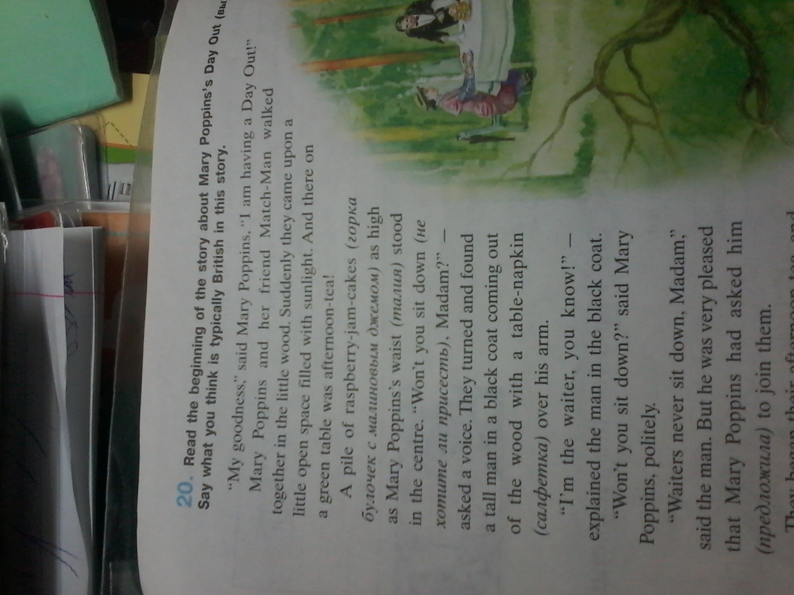 Моя доброта сказала Мэри Поппинс. У меня есть День, когда Мэри Поппинс и ее друг Матч-человек пошли вместе в маленьком лесу. Внезапно они натолкнулись на небольшое открытое пространство, наполненное солнечным светом. И там на зеленом столе был послеобеденный чай! В центре стояла куча малино-варенья, столь же высоко, как талия Мэри Поппинс. «Разве ты не сядешь, мадам?» - спросил голос.Они повернулись и нашли высокого человека в черном пальто, выходящем из дерева, с салфеткой на руке: «Я, официант, знаешь!» - объяснил человек в черном пальто. Ты не сядешь? - вежливо сказала Мэри Поппинс. - Официанты никогда не садятся, - сказала мадам. Но он был очень доволен, что Мэри Поппинс попросила его присоединиться к ним.