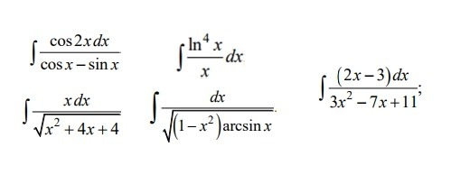 1); ; int  frac{cos2x, dx}{cosx-sinx}=int frac{(cos^2x-sin^2x)dx}{cosx-sinx}=int frac{(cosx-sinx)(cosx+sinx)}{cosx-sinx}dx=\\=int (cosx+sinx)dx=sinx-cosx+C\\2); ; int  frac{ln^4x}{x}dx=int ln^4xcdot  frac{dx}{x}}=[frac{dx}{x}=d(lnx)]= frac{ln^5x}{5}+C\\3); ; int  frac{dx}{sqrt{(1-x^2)arcsinx}}=int  frac{1}{sqrt{arcsinx}}cdot frac{dx}{sqrt{1-x^2}} =[frac{dx}{sqrt{1-x^2}}=d(arcsinx)]=\\=int  frac{d(arcsinx)}{sqrt{arcsinx}} =2sqrt{arcsinx}+C