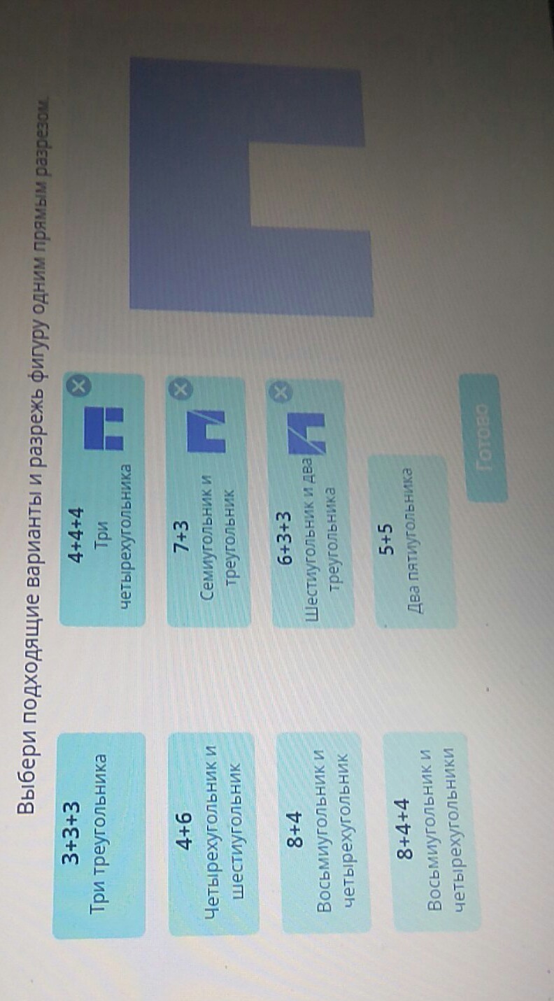 выбери подходящие варианты и разрежь фигуру одним прямым разрезом.