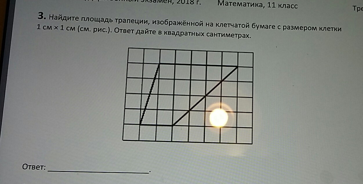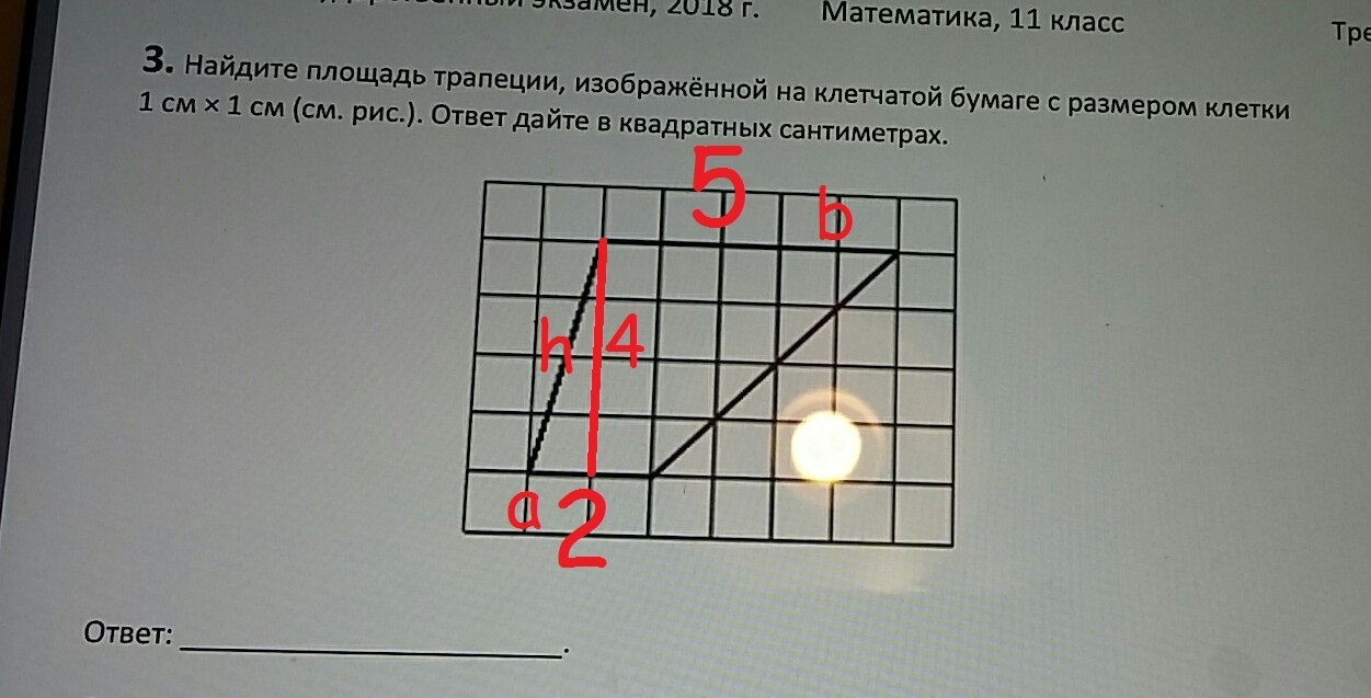 Нижнее основание две клеточки, верхнее основание 5 клеточек, а высота 4 клеточки. Площадь трапеции равна полусумме оснований, умноженной на высоту.