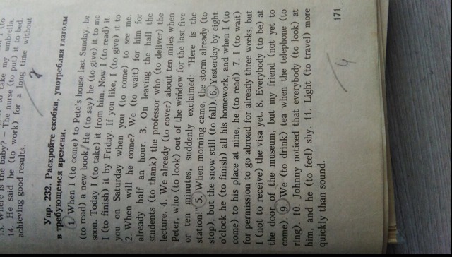 1. When I CAME to Pete's house last Sunday, he WAS READING a new book. He SAID he WOULD GIVE it to me soon. Today I HAVE TAKEN it from him. Now I AM READING) it. I WILL HAVE FINISHED it by Friday. If you like, I WILL GIVE it to you on Saturday when you COME to see me. 2. When will he come? We HAVE BEEN WAITING for him for already half an hour. 3. On leaving the hall the students THANKED the professor who HAD DELIVERED the lecture. 4. We already HAD COVERED about ten miles when Peter, who HAD BEEN LOOKING out of the window for the last five or ten minutes, suddenly exclaimed: «Here is the station!» 5. When morning came, the storm HAD already STOPPED, but the snow WAS still FALLING. 6. Yesterday by eight o'clock he HAD FINISHED all his homework, and when I CAME to his place at nine, he WAS READING. 7. I HAVE BEEN WAITING for permission to go abroad for already three weeks, but I HAVEN'T RECEIVED the visa yet. 8. Everybody IS at the door of the museum, but my friend HASN'T yet COME. 9. We WERE DRINKING tea when the telephone RANG. 10.Johnny noticed that evrybody WAS LOOKINGat him, and he FELT shy. 11. Light TRAVELS more quickly than sound.