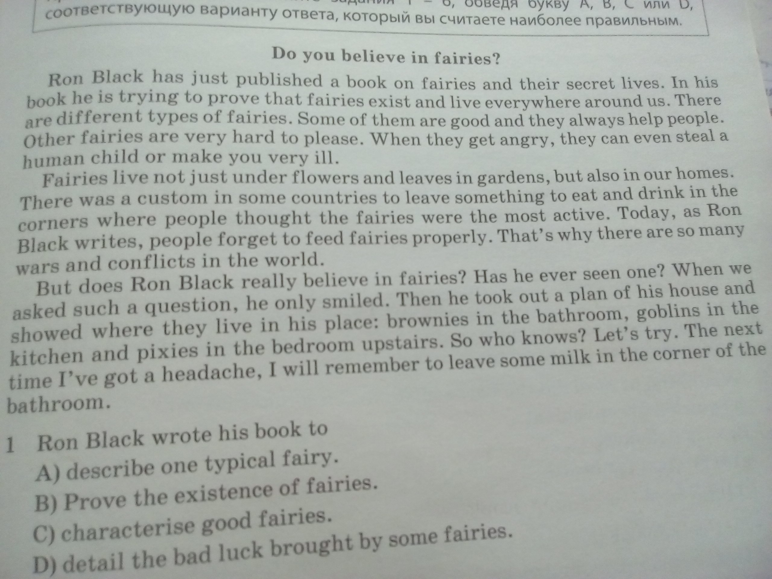 Вы верите в феи? Рон Блэк только что опубликовал книгу о феях и их секретных жизнях. В своей книге он пытается доказать, что феи существуют и живут повсюду вокруг нас. Существуют различные типы фей. Некоторые из них хороши, и они всегда помогают людям. Другим фей очень трудно угодить. Когда они разозлятся, они могут даже украсть человеческий ребенок или сделать вас очень больными. Феи живут не только под цветами и листьями в садах, но и в наших домах. В некоторых странах существовал обычай оставлять что-нибудь поесть и выпить в углах, где люди думали, что феи были самыми активными. Сегодня, как пишет Рон Блэк, люди забывают правильно кормить феи. Вот почему в мире так много войн и конфликтов. Но действительно ли Рон Блэк действительно верит в феи? Он когда-нибудь видел его? Когда мы задали такой вопрос, он только улыбнулся. Затем он достал план своего дома и показал, где они живут на его месте: пирожные в ванной, гоблины на кухне и пикси в спальне наверху. Так кто знает? Давай попробуем. В следующий раз, когда у меня начнется головная боль, я запомню, что оставлю немного молока в углу ванной комнаты
