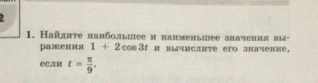 Найдите наибольшеее и наименьшее значение выражения 1+2cos3t и вычислите его значение, если t=pi/9.