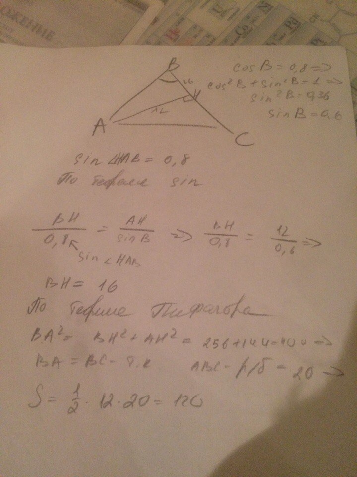 косинус угла при вершине равнобедренного треугольника равен 0.8, а высота, опущенная на боковую сторону равна 12. найти площадь треугольника