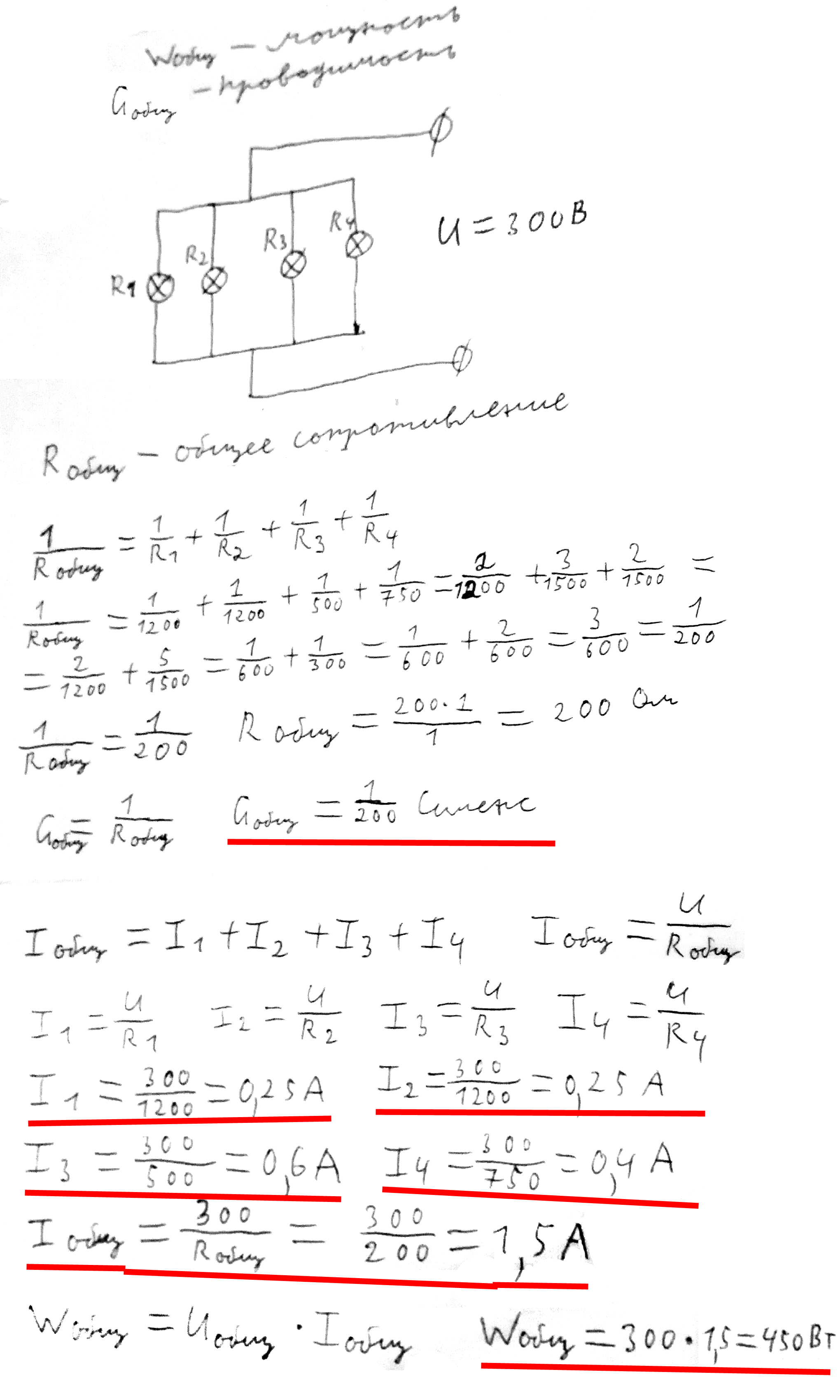 К источнику с напряжением 300В подключены паралельно 4 лампочки накаливания с сопротивлением R1=R2=1200,R3=500,R4=750.определить общее сопротивление и проводимость цепи,том в лампах и общую потребляемую мощность