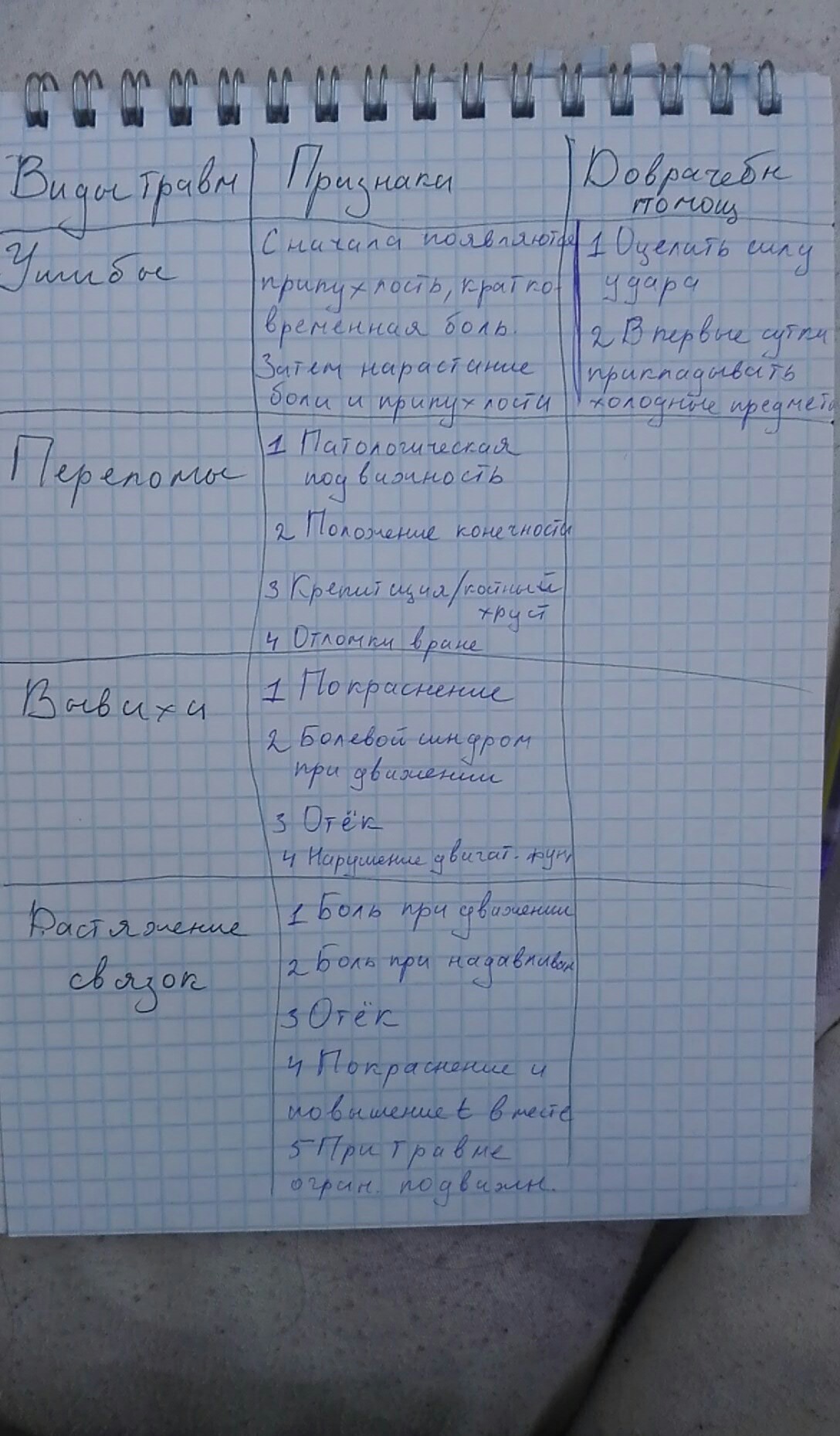 |Виды травм|Признаки|Доврачебная помощь|