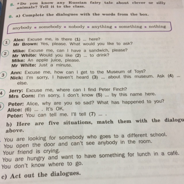1 - anybody, 2 - something, 3 - anything, 4 - somebody, 5 - nobody, 6,7 - nothing