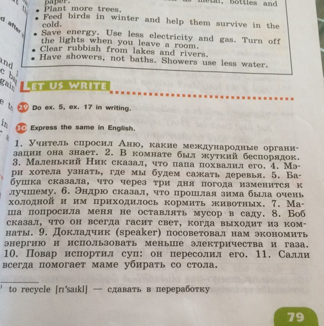 Teacher asked Anna what international organization does he know. Andrey said that the last winter was very cold and they had to feed animals. Masha asked me not to leave the trash in the garden. Bob said he always switches off the light when he get out the room. Speaker advised us to save the energy and use less the electricity and the gas. Cooker spoiled the soup. He overdone with a salt. Sally always help her mom to clean the table
