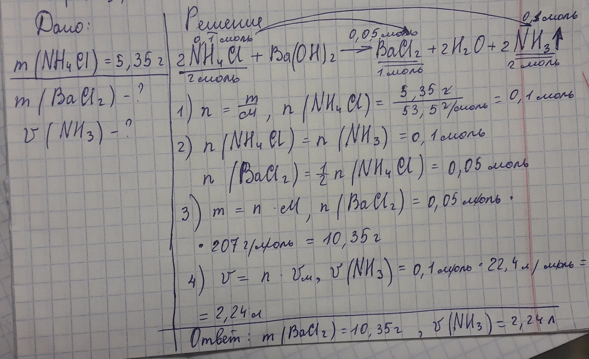 Обчисліть об'єм газу та масу солі, що утворять я в результаті взаємодії амоній хлориду масою 5,35 г з барій гідроксидом