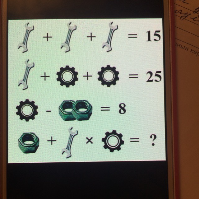 1 ключ+(назовём это колесо)+ колесо+колесо=25, значит 5+колесо+колесо=25