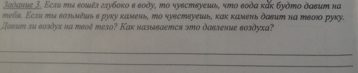 Если ты вошёл глубоко в воду,то чувствуешь,что вода как будто давит на тебя.Если ты возьмёшь в руку камень,то чувствуешь,как камень давит на твою руку.Давит ли воздух на твоё тело?Как называется это давление воздуха?