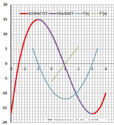 7. Корни при Х1=-1. Максимум Ymax(-1)= 15,при Х2 = 3, минимум – Ymin(3) = - 17.