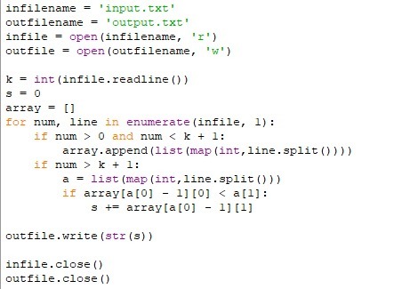 В первой строке входного файла input.txt записано целое число K – количество видов автомобилей в автопарке. В следующих K строках файла содержится по два числа для каждого вида автомобиля: m ‑ максимально допустимый износ в процентах и c ‑ стоимость замены колес. В (K+2)-ой строке файла содержится число N – количество автомобилей в автопарке. Далее следует N строк, каждая из которых содержит два числа: v ‑ вид автомобиля и p ‑ износ его колес в процентах. Колеса нужно заменять в случае, если износ больше максимально допустимого износа для данного вида автомобиля.