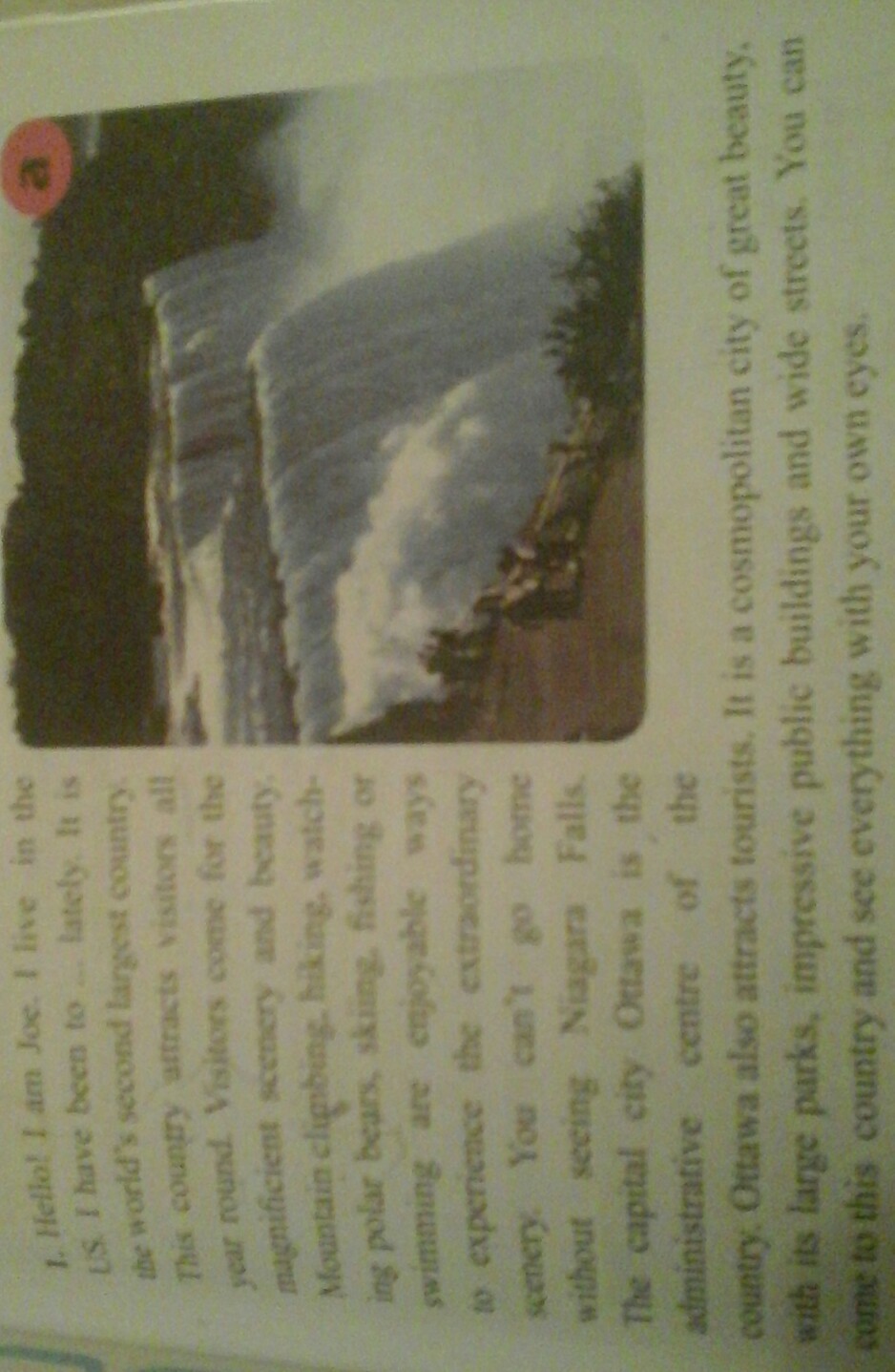 1. Привет! Я Джо. Я живу в Соединённых Штатах. Я был в Канаде недавно. Это вторая крупнейшая страна в мире. Эта страна привлекает гостей круглый год. Гости приезжают, чтобы полюбоваться великолепными пейзажами и красотой. Скалолазание, туризм, наблюдение за белыми медведями, лыжный спорт, рыбалка или купание идеально подходят для того, чтобы насладится природными пейзажами. Вы не сможете уйти домой не повидав Ниагарский водопад. Столица Оттава является административным центром страны. Оттава также привлекает туристов. Это космополитический город великой красоты, красивых парков, впечатляющий строений и обширных улиц. Вы можете приехать в эту страну и увидеть всё своими собственными глазами.