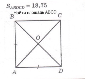 Квадрат состоит из 4-х одинаковых треугольников. Площадь 1-го = 18,75:3=6,25 Площадь всего квадрата - S ABCD= 18,75+6,25=25см²