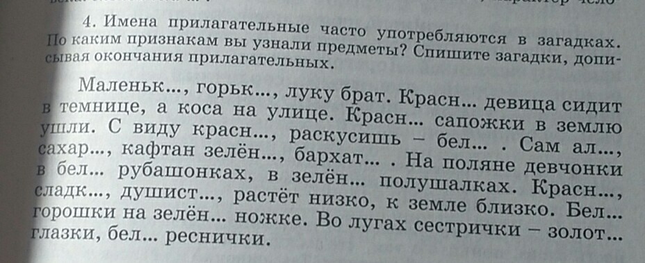 имена прилагательные часто употребляются в загадках По каким признакам вы узнали предметы Спишите загадки дописывая окончания прилагательных.