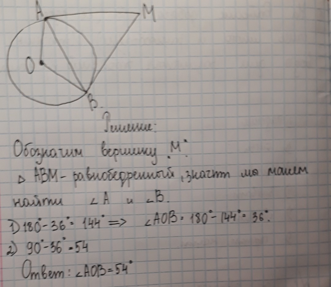 касательные в точки A и B к окружности с центром в точке O пересикаются под углом 36 градусов. найдите угол ABO ответ дайте в градусах бъясните пожалусто