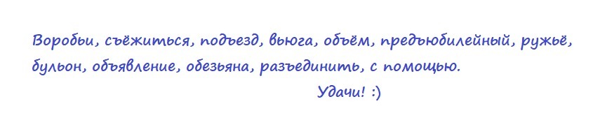 ВоробЬи, сЪежиться, подЪезд, вЬюга, обЪем, предЪюбилейный, ружЬе, булЬон, обЪявление, обезЬяна, разЪеденить, с помощЬю.