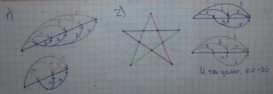 Соединяем стрелкой выбранную точку с другой, которая находится правее выбран. т. (для правой точки соединений не будет). И пересчитываем все стрелки, всего их 15 (можно обойтись и без стрелок, сразу считать, но со стрелками наглядно видно, что мы считаем).