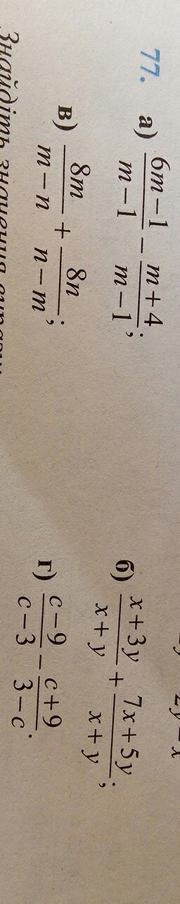 поможіть будь ласка № 77 потрібно спростити вираз (додавання і віднімання дробів з однаковим и знаменниками)