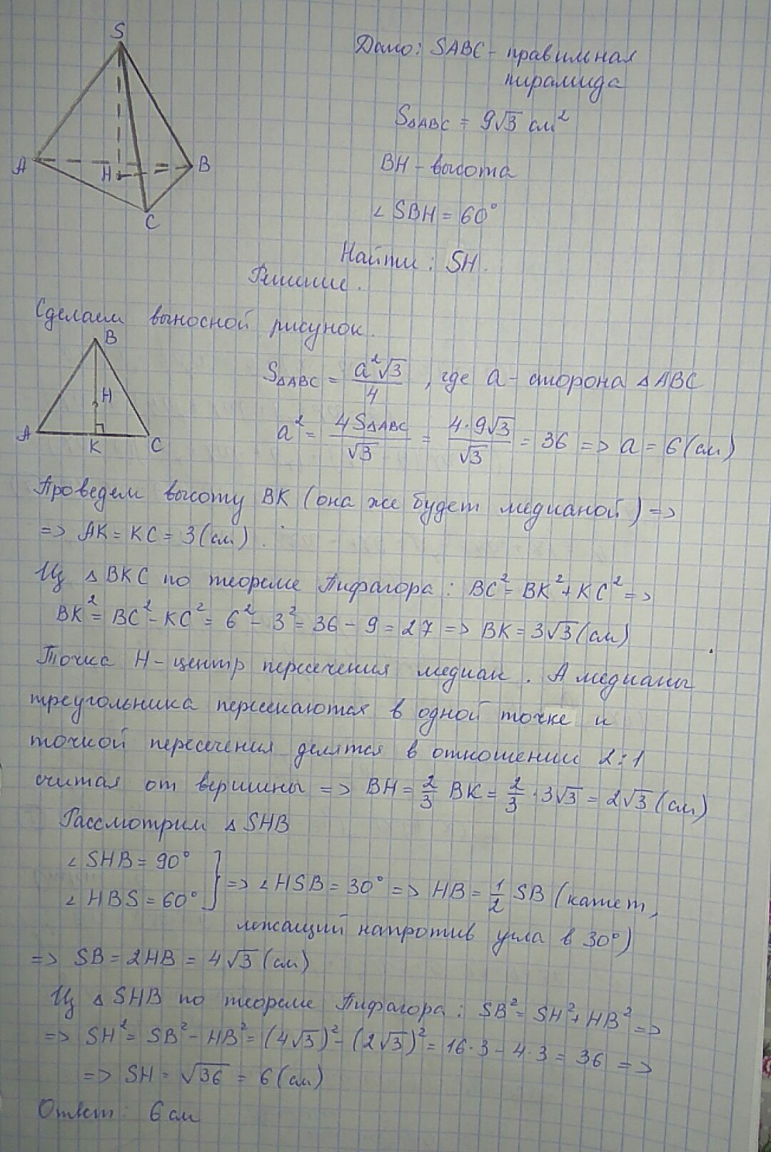 в правильной треугольной пирамиде найдите высоту, если площадь основания 9√3 см, а боковое ребро образовывает с площадью основания угол 60°