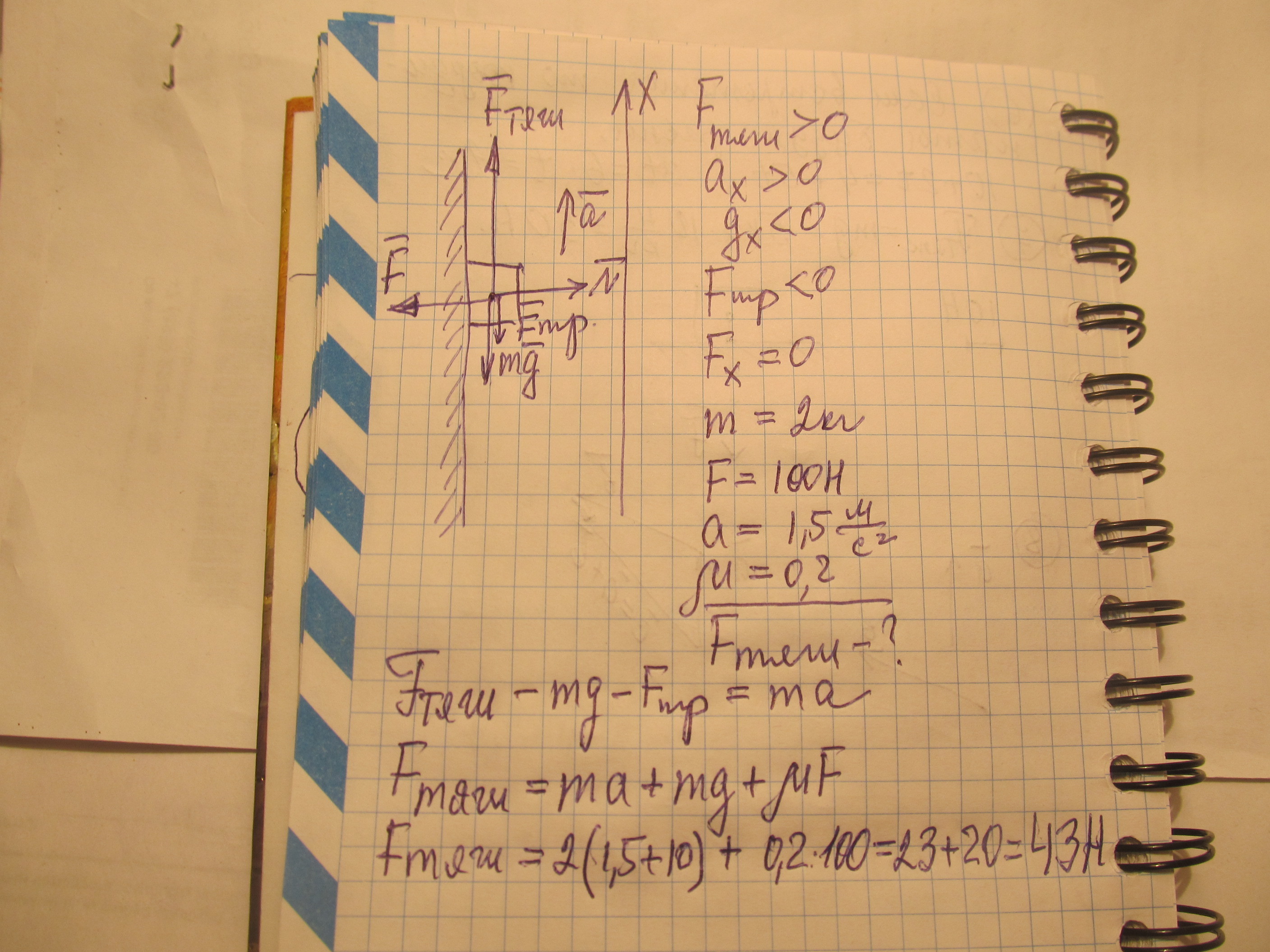 СРОЧНО!!! Груз массой 2 кг, прижат силой 100 Н к вертикальной стене, движется вверх с ускорением 1,5 м / с ^ 2. Чему равна сила тяги, если коэффициент трения 0,2??