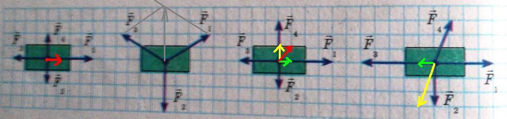 рис 3. Равнодействующая четырёх сил равна красному вектору. Направлена под углом 45° к F1. Ускорение есть, направлено также, как равнодействующая сила.