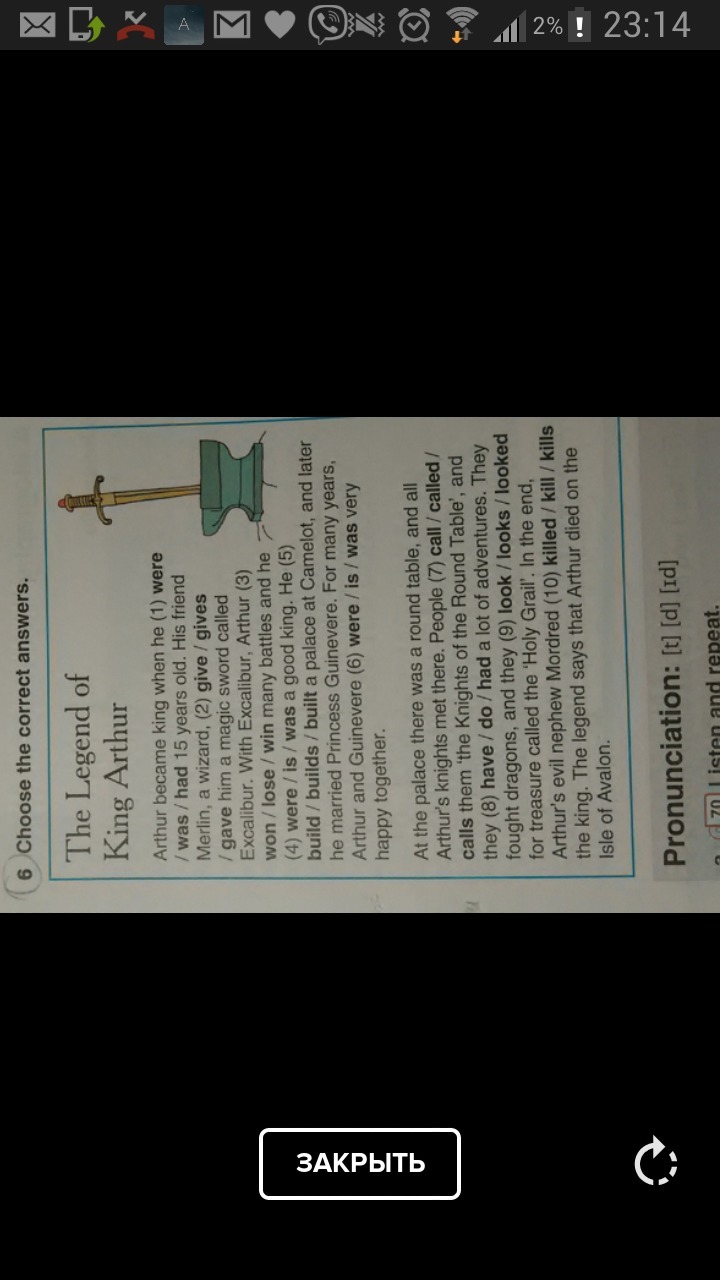 Легенда о короле Артуре. Артур стал королем, когда ему (1) было 15 лет. Его друг Мерлин, волшебник (2) отдал ему волшебный меч под названием Экскалибур. С экскалибуром Артур (3) выиграл, в много сражений, и он (4) был хорошим копьем. Он (6) построил дворец в Камелоте, а позже он женился на Прннменте Гвиневере. На протяжении многих лет Артур и Гвиневер (6) были / были очень счастливы вместе. Во дворце был круглый стол, и там встречались рыцари Артура. Люди (7) звонят / называли их Рыцарями Круглого Стола ', и у них (8) были много приключений. Они сражались с драконами, и они (9) выглядели похожими на Священных Граф. В конце концов, сокровище злого племянника Артура Мордреда (10) убило / убило убивает короля. Легенда гласит, что Артур умер на острове Авалон.