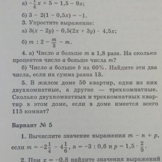 5. Пусть х - число двухкомнатных квартир, а у - число трехкомнатных квартир. Тогда (х+у) - общее число квартир и (2х+3у) - общее число комнат в доме.