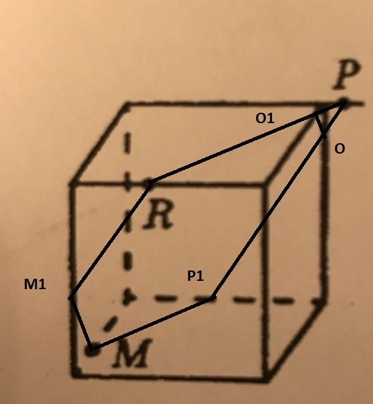 R и Р лежат в одной плоскости -соединяем их, О1-точка пересечения сечения с ребром куба. Через М проводим прямую, параллельную соединенной линии РR. так как грани куба параллельны-получая при этом точку Р1. Р и Р1 лежат в одной плоскости, соединяя их получим точку О. О1 и О тоже лежат в одной плоскости, соединяем их и параллельно ей проводим прямую из точки М(грани параллельны)-получаем последнюю точку сечения М1. Получен в сечении шестиугольник...