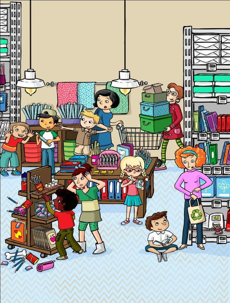 Когда я смотрю на эту картинку, я понимаю что это всё происходило в магазине.В этом магазине происходит хаус, несколько предметов лежат на полу. Это произошло из за того что дети их уронили и не хотят их поднимать. Но ихние родители уговаривают чтобы они прибрались за собой.