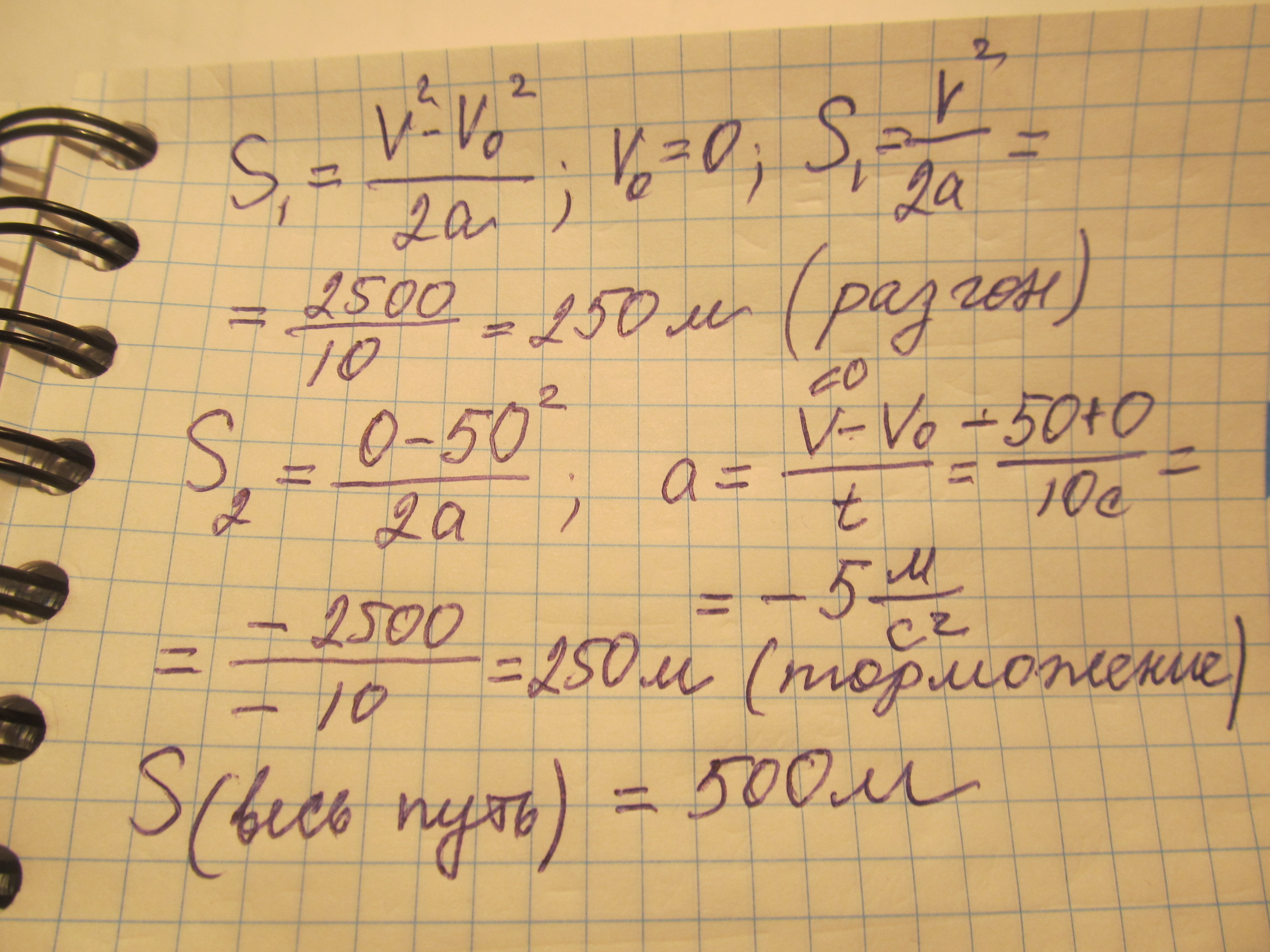 V; Vo - конечная и начальная скорость в 2-х случаях. При разгоне Vo=0; V=50; при торможении Vo=50; V=0.