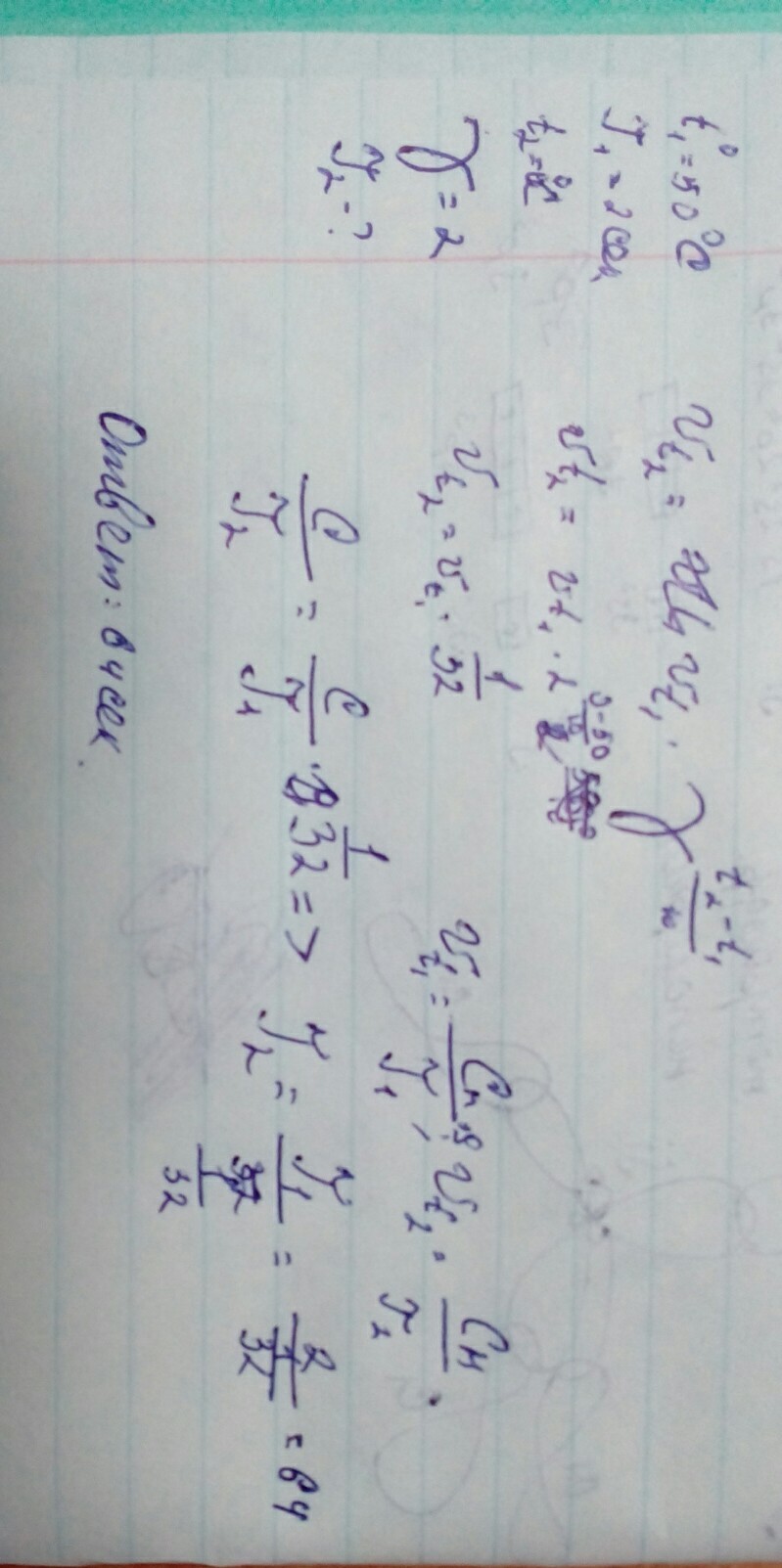 При 50*С некоторая реакция заканчивается за 2 секунды.Определить за сколько закончится эта реакция при 0*С если температура коэффициента скорости равна двум
