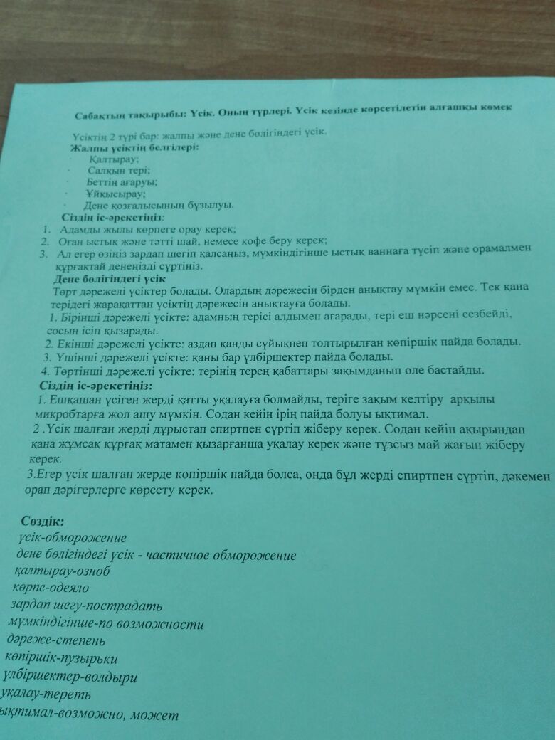 2. Жалпы үсіктің белгілері қандай? Қалтырау, беттің ағаруы, ұйқысырау, дене қозғалысының бұзылуы.