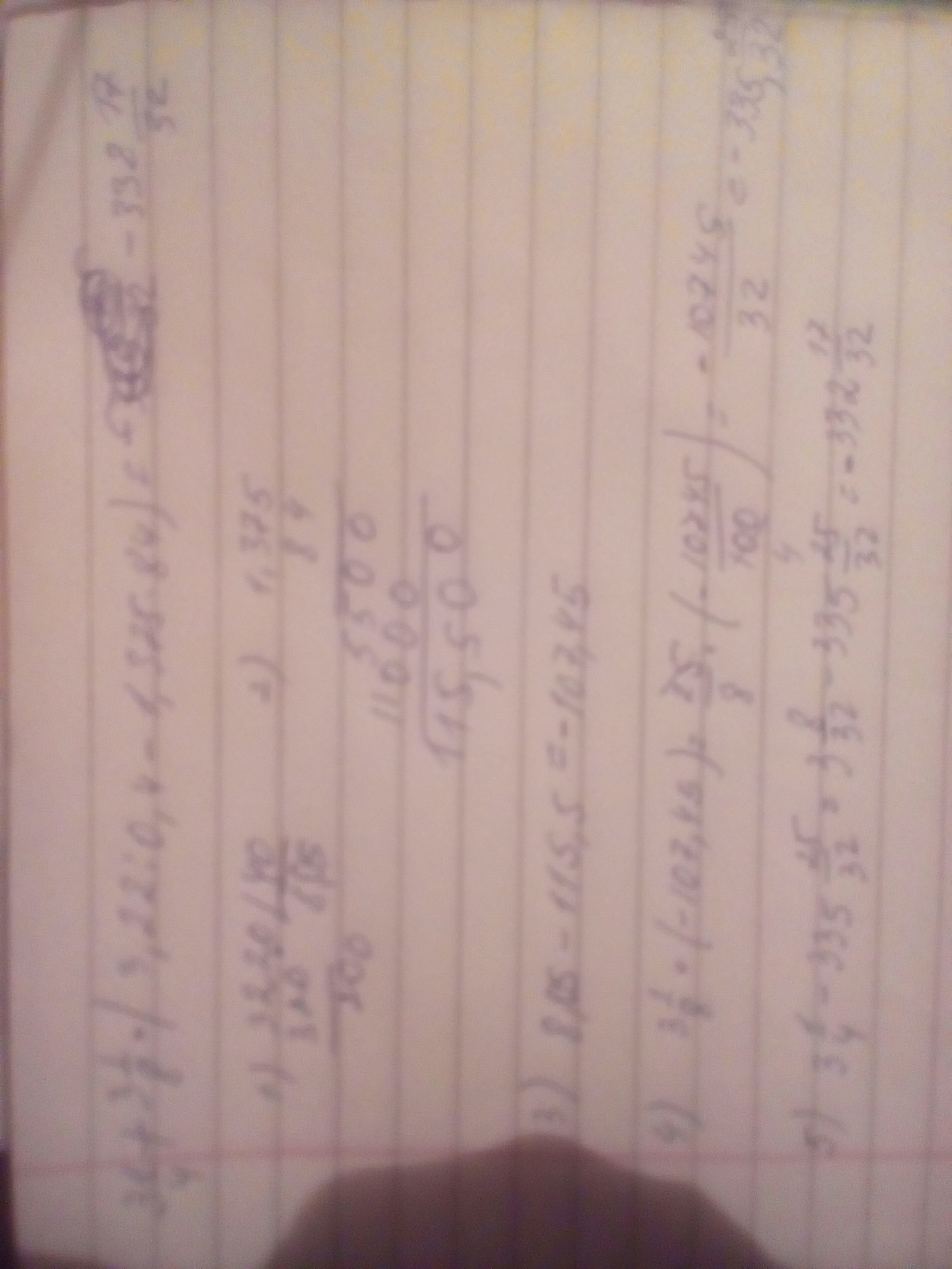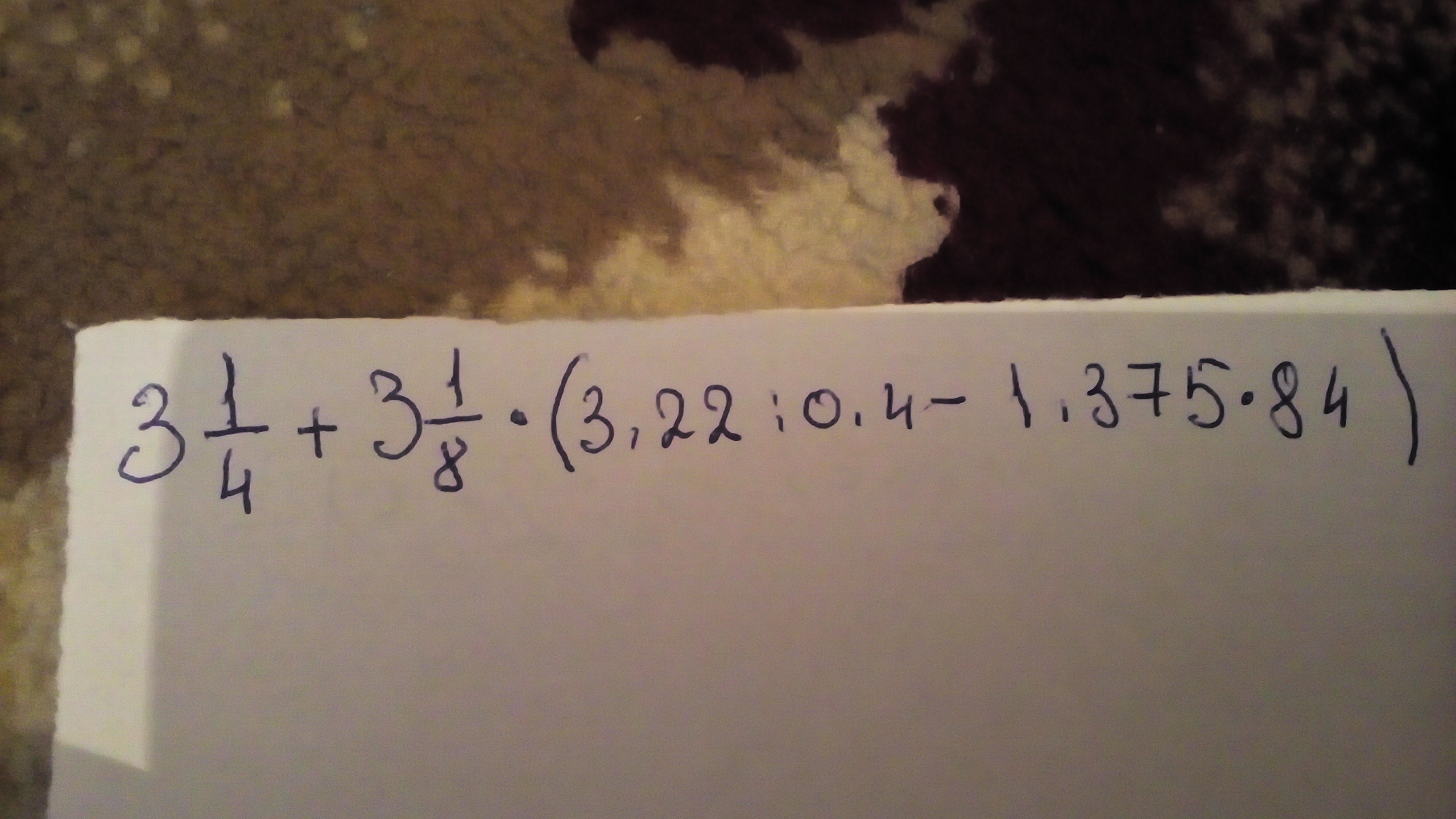 ....... .........................1)3,22:0,4=8,05. 2) 1,375*84=115,5. 3) 8,05-115,5=-107,45. 4)3. 1/8*(-107,45)=-335. 25/32. 5) 3 1/4-335. 25/32=-332. 17/32