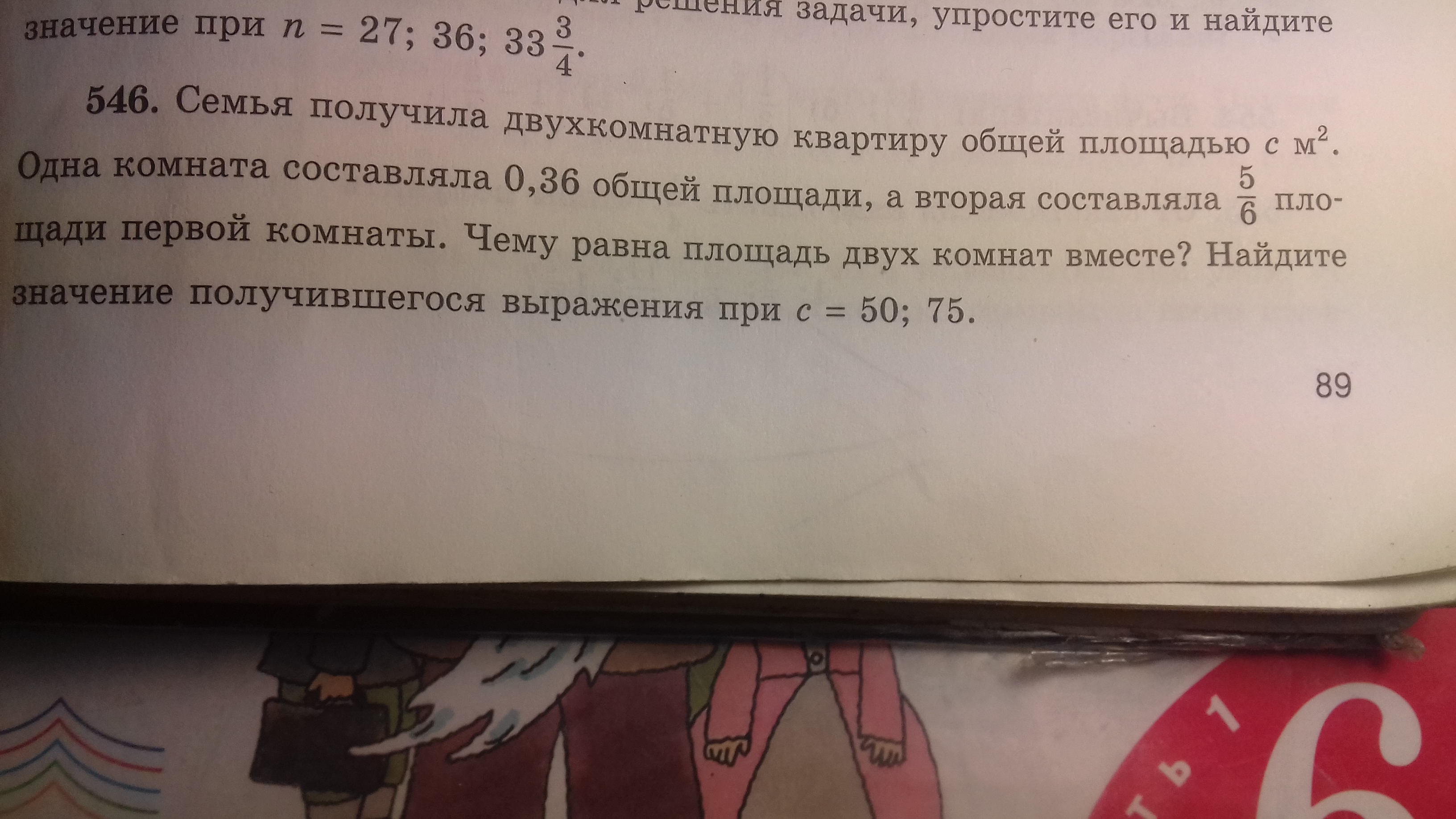 Помогите решить!!! Семья получила двухкомнатную квартиру общей площадью с м2. Одна комната составляла 0,36 общей площади, а вторая составляла 5/6 площади первой комнаты. Чему равна площадь двух комнат вместе? Найдите значение получившегося выражения при с= 50; 75