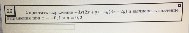 Упросить выражение -3х(2х+y) - 4y(3x-2y) и вычислить значение выражения при x=-0,1 и y=0,2